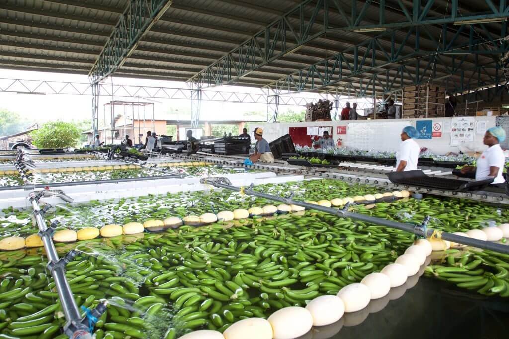 After nine months, the bananas are harvested while still green. At the packhouse they are inspected and sorted for export. Buyers of fruit in the UK want unbruised bananas and so very high standards are set. If the bananas do not meet these standards they are usually sold locally at a much lower price. The fruit is then transported to ports to be packed in refrigerated ships called reefers (bananas take between six and twelve days to get to the UK/Europe). In order to increase shelf life, they are transported at a temperature of 13.3°C, and require careful handling in order to prevent damage. Humidity, ventilation and temperature conditions are also carefully monitored in order to maintain quality. When the bananas arrive at their destination port they are first sent to ripening rooms (a process involving ethylene gas) and then sent to the shops.